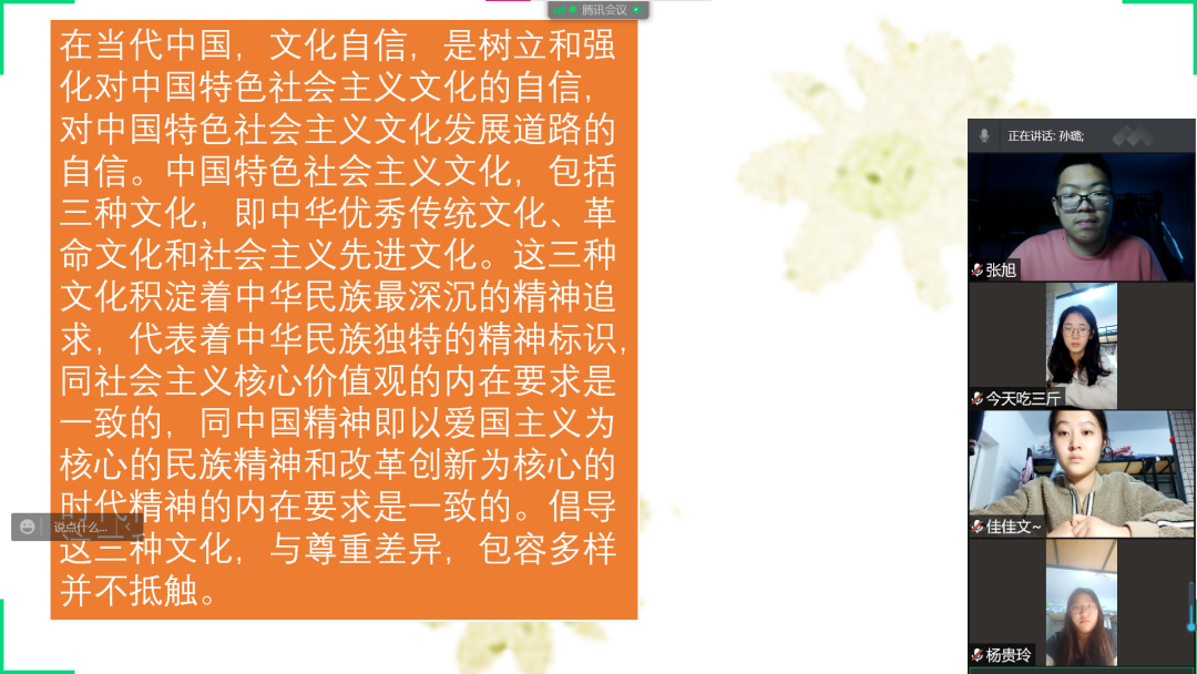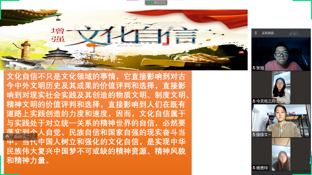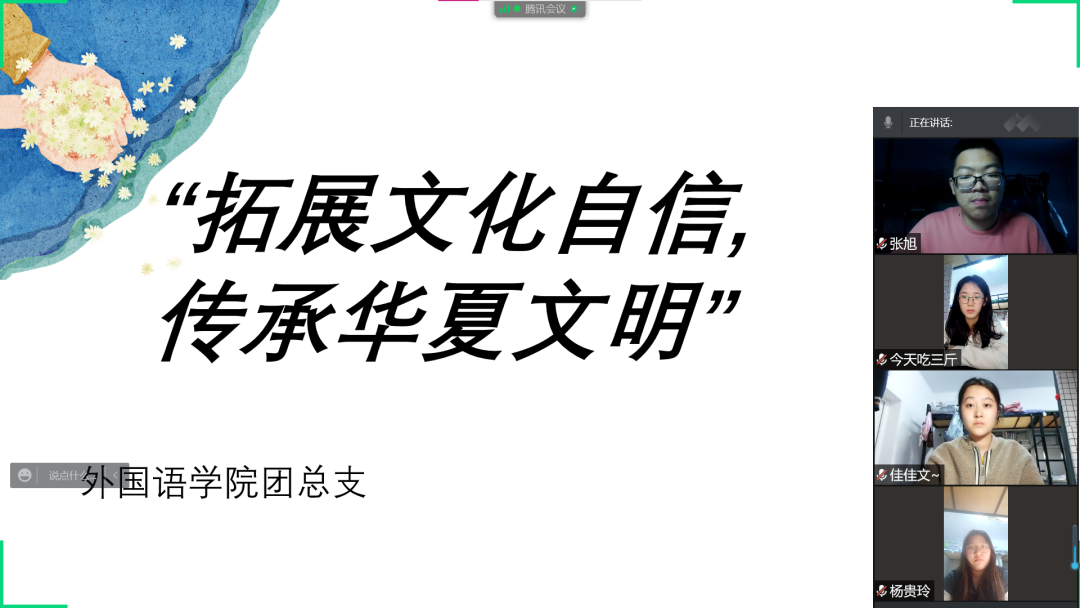 活动伊始,主持人向同学们讲述文化自信是一个民族,一个国家对自身文化价值的充分肯定和认同。其次,主持人阐释中华优秀传统文化不仅是社会道德的核心要素,也是国家软实力的重要标志。最后,主持人呼吁同学们要坚定文化自信,同时在文化的传承与创新上作出表率,自觉承担起推动中华优秀传统文化发展的重任。