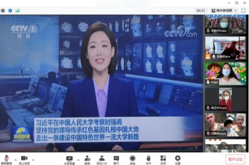 活动伊始,主持人组织同学们观看新闻联播,习近平总书记发表重要讲话,希望全国广大青年牢记党的教诲,立志民族复兴,不负韶华,不负时代,不负人民,在青春的赛道上奋力奔跑,争取跑出当代青年的最好成绩。