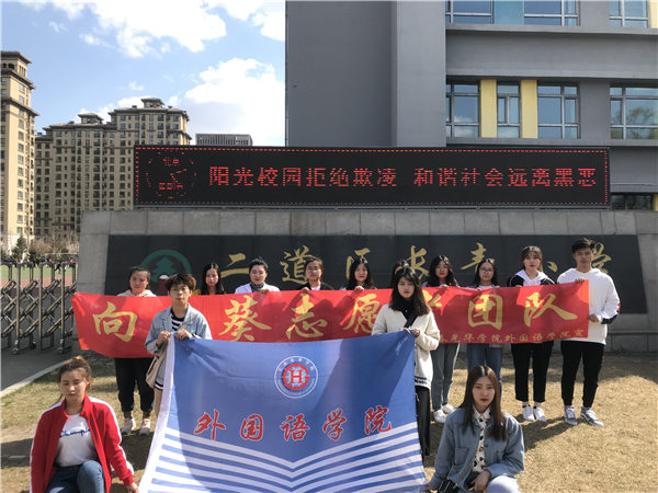 志愿者们在校门前进行合影