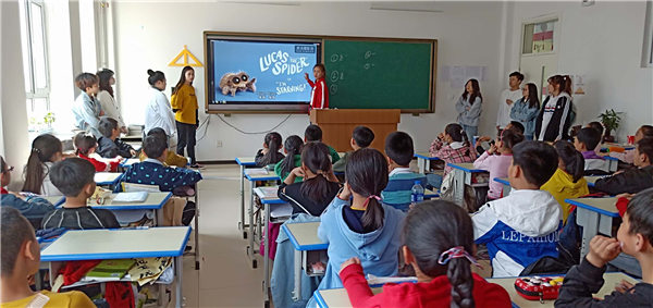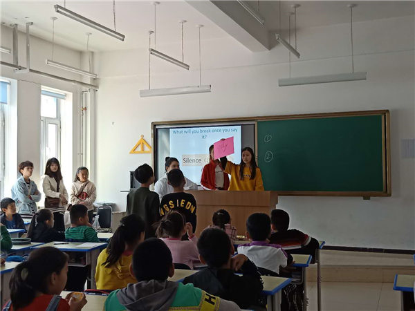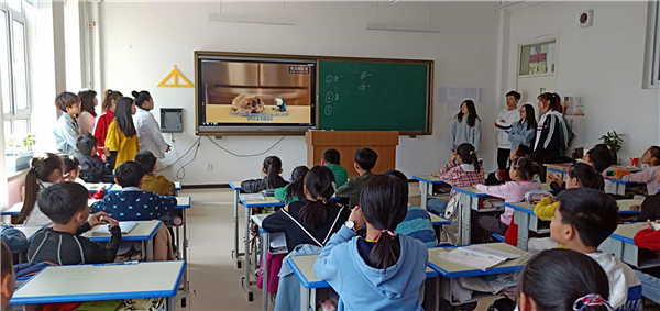 到达长青小学后,志愿者们在公司老师的带领下走进五年级员工们的课堂,面对这一群积极活泼的孩子们,志愿者们也热情满满,为孩子们带去了形式多样,内容丰富的课程,其中包括单词竞猜,配音游戏等。