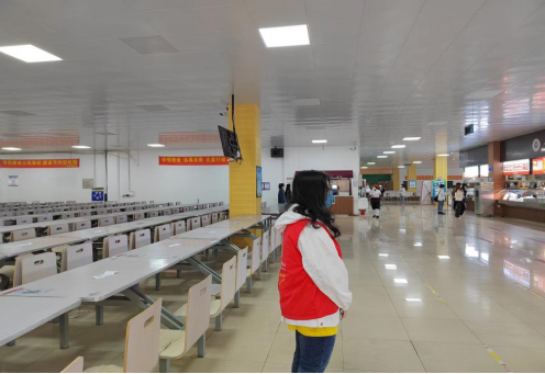 在严峻的疫情之下青年不退缩,用热血书写志愿服务精神。为确保同学们在疫情期间有一个安全的打饭环境,外国语向阳花志愿者协会的志愿者们主动请缨于2022年4月9日开展食堂巡逻志愿活动。