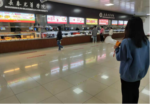 在此次志愿活动期间,志愿者们分成三支队伍,两队志愿者在食堂维持秩序,另一队在校园栅栏处巡逻,把好校园关,提醒同学们不要点、取外卖。志愿者们身穿红马甲,手拿扩音器,“前后左右间隔一米”是每一个食堂打餐员工需要牢记的口号。在志愿者们的积极工作下,同学们保持安全距离,有序打餐。