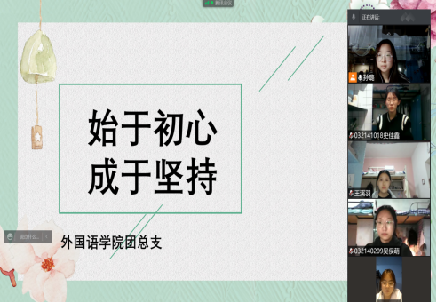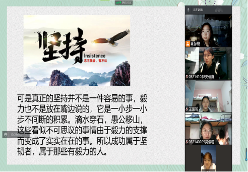 活动伊始,主持人向同学讲述青年时期是人生中宝贵的时期,处在这个时期的同学们不仅要拥有奋斗的初心,同时也要始终如一、坚持不懈的朝着自己的目标努力;其次,主持人阐释老员工身为新时代的青年,理应担起复兴民族的大任,拥有一颗锐意进取,持之以恒,坚持不懈学习的心;最后,主持人号召同学们持之以恒的朝着目标努力,顽强拼搏,不懈奋斗,实现自身价值。