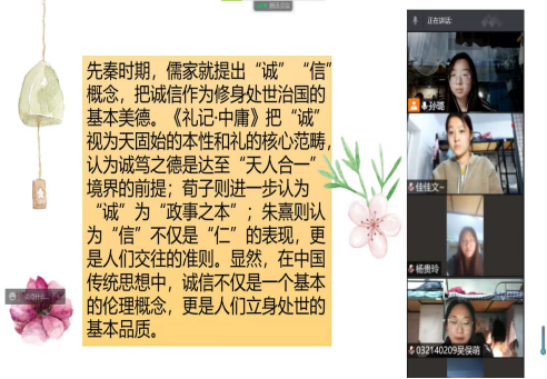 活动伊始,主持人向同学们讲述诚信是公民基本的道德规范,是个人立身处世的准则,是衡量个人品行优劣的道德标准之一,是践行社会主义核心价值观的必然要求;其次,主持人阐释所谓诚信,即诚实与守信,要求个人真实表达内心,且做到言行一致,信守诺言;最后,主持人号召同学们用行动来践行诚信品质,时刻谨记诚信待人,养成求真务实、言行一致的诚信美德。