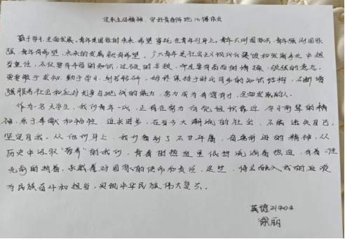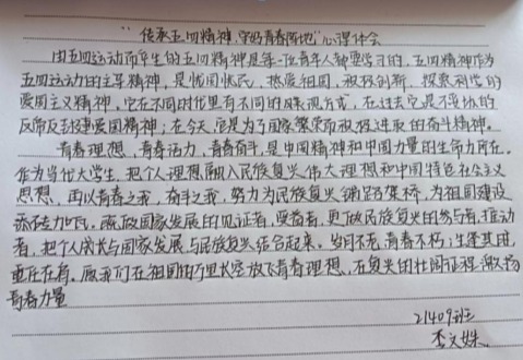 此次活动顺利结束后,青年团员明白了五四精神的形成不是一朝一夕的事情,是近代以来中国走向世界、探索未来的结果,是近代中国先贤们不屈不挠、艰苦奋斗的结果,是中华民族自强不息、不断超越自我精神的现代升华。在新时代中国特色社会主义的实践中,五四精神依然是激励中华儿女前进的无比丰富的营养剂,作为当代青年的我们要在新时代让五四精神更加熠熠生辉。