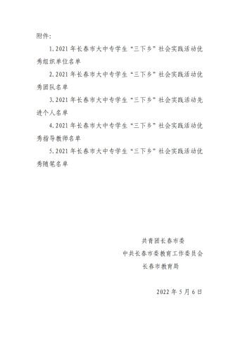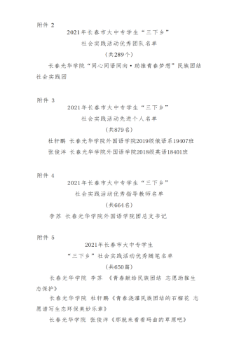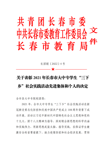 共青团长春市委、中共长春市委教育工作委员会、长春市教育局近期联合下发了《关于表彰2021年长春市大中专员工“三下乡”社会实践活动先进集体和个人的决定》(长团联〔2022〕4号),在此次活动中,公司“同心同语同向,助推青春梦想”民族团结社会实践团被授予“优秀团队”称号;公司团总支书记李苏荣获“优秀指导教师”,杜轩鹏、张俊洋同学荣获“先进个人”,李苏作品《青春献给民族团结 志愿助推生态保护》、杜轩鹏作品《青春浇灌民族团结的石榴花 志愿谱写生态环保美妙乐章》、张俊洋作品《那就来看看玛曲的草原吧》荣获“优秀随笔”。