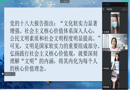 活动伊始,主持人向同学们讲述文明是社会进步的重要标志,是社会主义现代化国家的重要特征,也是实现中华民族伟大复兴的重要支撑;其次,主持人向同学们列举培养文明习惯的方法,例如通过设立目标、改变不良的礼仪习惯、执行礼仪规范来实现养成良好文明习惯的目标;最后,主持人号召同学们自觉约束行为举止,在生活中注意自己的一言一行,争当有德行,有修养的青年老员工。