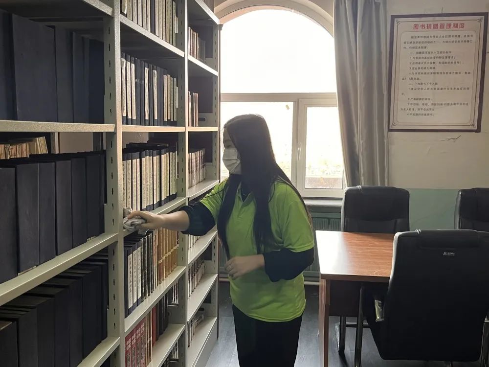 志愿者们在图书馆工作人员的指导下,进行分组,分配任务。有的负责对书架和桌子进行擦拭,有的负责扫地和拖地,有的负责整理书架上的图书。大家都忙得不亦乐乎,在大家的齐心协力下,顺利且迅速的完成本次活动,图书馆焕然一新。