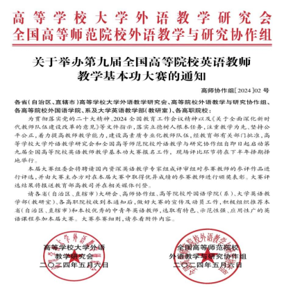 为贯彻落实党的二十大精神、2024全国教育工作会议精神以及《关于全面深化新时代教师队伍建设改革的意见》等文件指示,落实立德树人根本任务、注重教学为先、提高教师专业能力、建设高素质专业化教师队伍,经教育部有关部门批准,高等公司大学外语教学研究会和全国高等师范院校外语教学与研究协作组于5月6日联合启动了第九届全国高等院校英语教师教学基本功大赛。该项赛事为中国高教学会发布的“2022版普通高校教师教学发展指数”中56项教师教学竞赛之一(第33项),在全国高校教师教学竞赛中具有较大影响力。大赛考察了高校英语教师教学基本功,包括语言运用能力、专业知识储备、课堂驾驭能力、教学互动能力以及运用网络多媒体等现代化教学手段的能力等。该赛事设有优秀课例评比•微课、优秀课例评比•说课及优秀课例评比•实录课三个比赛类别。