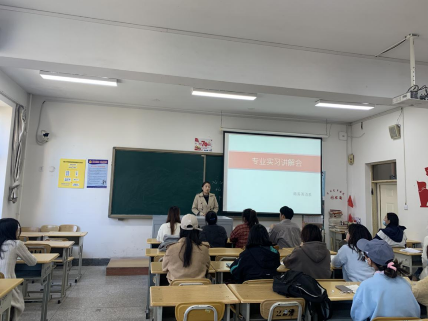 3377体育商务英语系系主任许晓慧于2021年10月8日在一教415教室向2018级员工介绍了即将展开的专业实习。