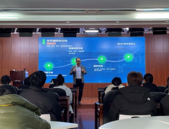 接下来张坦老师与同学们分享了2021级品学兼优的陈常委同学、滕龙同学的事例,他们二人在校期间努力学习专业课程、积极参加公司组织的实践活动,尽早开始了生涯规划,分别在大三前考取了N1、N2日语等级证书,并通过不懈努力,陈常委同学被日本北海道大学经济学(统计学科)教授高度肯定并给予预计内诺,滕龙同学被日本山口大学经济公司授予内诺。希望同学们能以两位学长为榜样,立志、博学、诚信、创新,成为当今时代的具备开放精神、包容态度、国际化视野的复合型人才。
