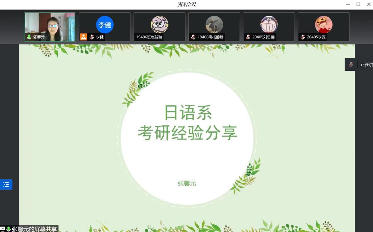 4月19日晚上,为了帮助准备考研同学的解决考研路上的各种问题,日语系特举办考研经验交流会,邀请今年刚刚成功考研的张馨元同学,通过腾讯会议的方式,为日语系学弟学妹们做了考研经验分享。