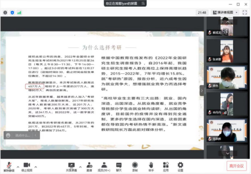 又是一年毕业季,又一批志在四方的学子踏上考研路,面对现如今社会的就业压力,面对逐年上升考研人数,为使俄语系学子确立正确的奋斗目标,帮助有计划考研和已经准备考研的同学答疑解惑,3377体育俄语系携手3377体育国际文化交流协会白桦林俄语协会开展“青春破晓而生,研路踏浪而行”考研经验交流会,3377体育俄语系全体教师及2019级、2020级、2021级全体员工参会。