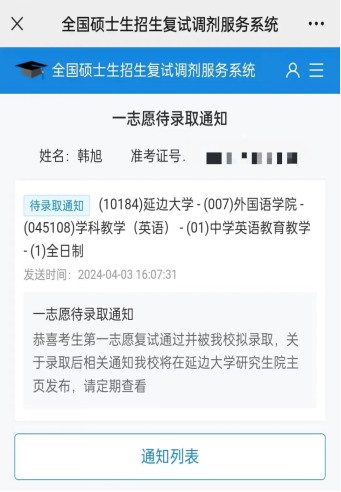 4.收到录取通知 4月3日下午,我看到了研究生院官网发布的录取名单里有我的名字,不久学信网就发来了一志愿拟录取通知,我久久不能平复心情,大哭了一场。这一路走来没有哭过,到结尾哭了,我想这也算是和我考研那段日子的盛大告别。我在去年春天编织的梦,历经了盛夏,深秋和寒冬,终于在第二年春天盛开了。