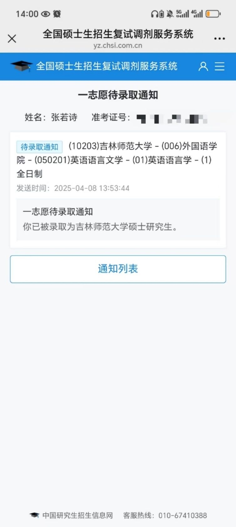 2025年4月,我收到了吉林师范大学的录取通知。面对这份消息,我感悟颇多,能以见证者和参与者的身份回顾我的考研历程,我深感荣幸,亦体会到千帆过尽的淡然和喜悦。感谢英语系的各位老师,感谢我的班导师和论文指导老师,老师们的教导和鼓励给予我莫大的前行动力。感谢我的父母及朋友对我的支持和陪伴。
