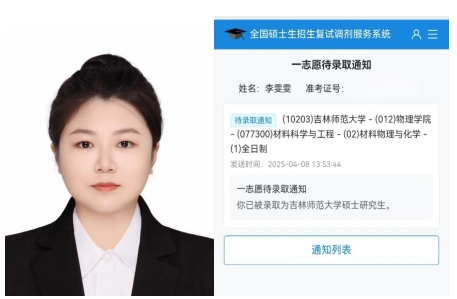 “心之所向,素履以往;生如逆旅,一苇以航。”在考研这条充满挑战的道路上,我始终怀揣着对梦想的执着追求,坚定地前行。2025年的春天,我收到了吉林师范大学的录取通知。本科期间学习英语专业的我,努力提升自己的语言能力。然而,我内心对材料科学一直充满好奇。幸运的是,公司丰富的学术资源和包容的氛围让我有机会探索新领域。老师们也非常支持我,鼓励我勇敢追求兴趣,为我提供了许多建议,这为我的跨考埋下了希望的种子。