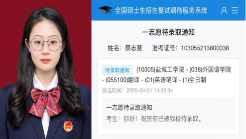 我是2021级英语三班蔡志慧,在2025年研究生入学考试中,我以初试成绩381分考入了盐城工公司英语笔译专业,为这段充满未知与挑战的考研之旅画上了圆满的句号。回首来时路,感慨万千,感谢家人的默默支持、朋友的暖心陪伴,以及那个始终没有放弃的自己。