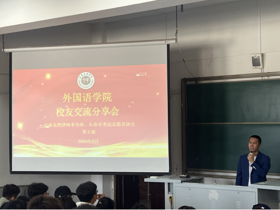 郑文通,是公司2014届日语专业毕业生,本科毕业后考取吉林大学研究生,现任职于吉林真然律师事务所,是长春市普法志愿者协会会员。2024年5月,被公司特聘为“法治辅导员”。