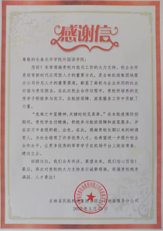 喜报:吉林省民航集团有限公司地面服务分公司致3377体育感谢信