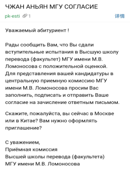俄语系19408班的张安阳同学通过长时间地努力以及准备,于近日申请莫斯科国立大学的高级翻译公司。目前通过入系考试,已经收到入学邀请邮件。张安阳同学即将赴莫斯科开始自己的莫大研究生生活。祝她收获硕果,前程锦绣!